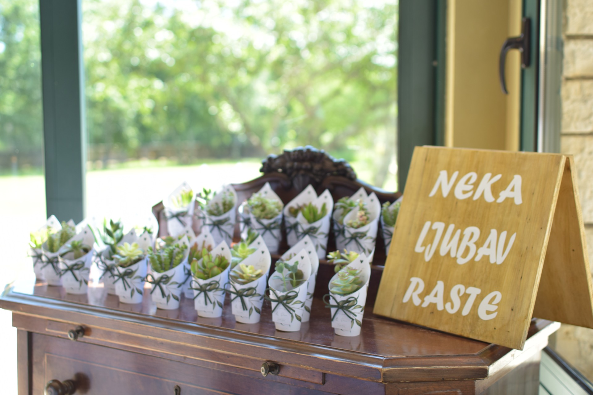 Aurori se nije sviđala niti jedna varijanta uobičajenih natpisa dobrodošlice, a htjele smo kombinaciju sa drvenim detaljima dekora. I tada Pir & Hir nastupa sa svojim skicama, idejama i kreiramo drveni stalak kakav se mojoj mladenki sviđa. Uostalom tako je Pir & Hir decor nastao, u trenutku kad sam shvatila da bilo koji element dekora mogu dizajnirati i stvoriti svojim rukama i da će to biti glavna misao vodilja u radu. Sav dekor mora biti izrađen kod nas, na našim strojevima, s našim alatima, našeg dizajna i naše izvedbe, naša montaža, aranžiranje i demontaža. I tako je moja mladenka dobila stalak kakav želi, ploču kakvu želi, font, slova u željenoj boji... Pripreme su dalje tekle glatko, cvijeće naručeno, preuzeto, inventar spreman, pegle spremne, aranžmani spremni, menu kartice, košara sa tuljcima i listićima maslina spremna...