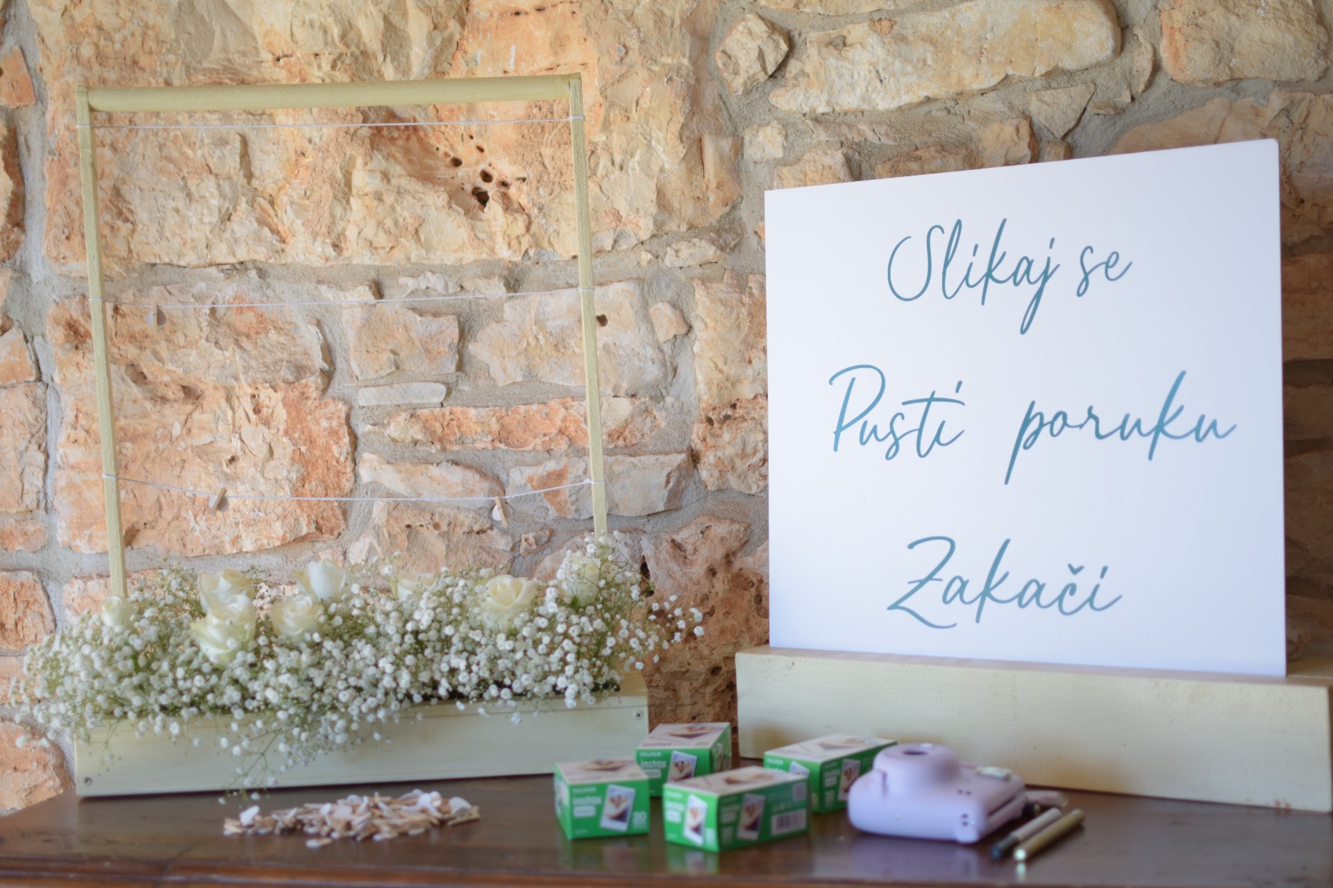 Crkva ukršena prije 10, i brzo jurimo po kombi, do stancije Negričani nam treba oko 40 minuta, tako da taman do 11 bi trebali stići. Ne smijemo kasniti ni sekunde jer ćemo onda imati manje vremena za rad, a ionako nam je i tih 3,5 sata premalo za sve elemente postaviti. Srećom stižemo točno na vrijeme, 20 minuta iskrcavamo kombi i vučemo karocelu bezbroj tura. Stiže i Dj Nikola, kojeg često srećemo po pirevima , i on iskrcava svoje škatule i sprema si radno mjesto za navečer. Usput se smijemo raznim glamuroznim dogodovština iz event svijeta. Vrijeme curi, peglam platna za glavni stol, a to traje poprilično. Nastavljamo sa stolovima za uzvanike, menu kartice sa rasporedom sjedenja i ubrusima ( e to uzme prilično vremena složit svaki ubrus po imenu), slaganje zahvalnica, kutkom za instax, natpisom dobrodošlice. Ovaj put nema pauze, marende, odmora, ničeg glamuroznog jer vrijeme curi a moramo završit dekor i napustit lokaciju u 14,30. Osjećam se kao najgora šefica na svijetu, nabijam tempo, presing, ali iskupit ću se na nekoj drugoj lokaciji drugom prilikom.
