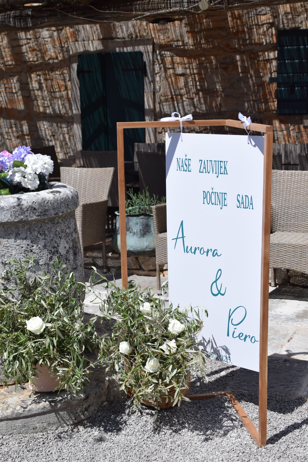 Aurori se nije sviđala niti jedna varijanta uobičajenih natpisa dobrodošlice, a htjele smo kombinaciju sa drvenim detaljima dekora. I tada Pir & Hir nastupa sa svojim skicama, idejama i kreiramo drveni stalak kakav se mojoj mladenki sviđa. Uostalom tako je Pir & Hir decor nastao, u trenutku kad sam shvatila da bilo koji element dekora mogu dizajnirati i stvoriti svojim rukama i da će to biti glavna misao vodilja u radu. Sav dekor mora biti izrađen kod nas, na našim strojevima, s našim alatima, našeg dizajna i naše izvedbe, naša montaža, aranžiranje i demontaža. I tako je moja mladenka dobila stalak kakav želi, ploču kakvu želi, font, slova u željenoj boji... Pripreme su dalje tekle glatko, cvijeće naručeno, preuzeto, inventar spreman, pegle spremne, aranžmani spremni, menu kartice, košara sa tuljcima i listićima maslina spremna...