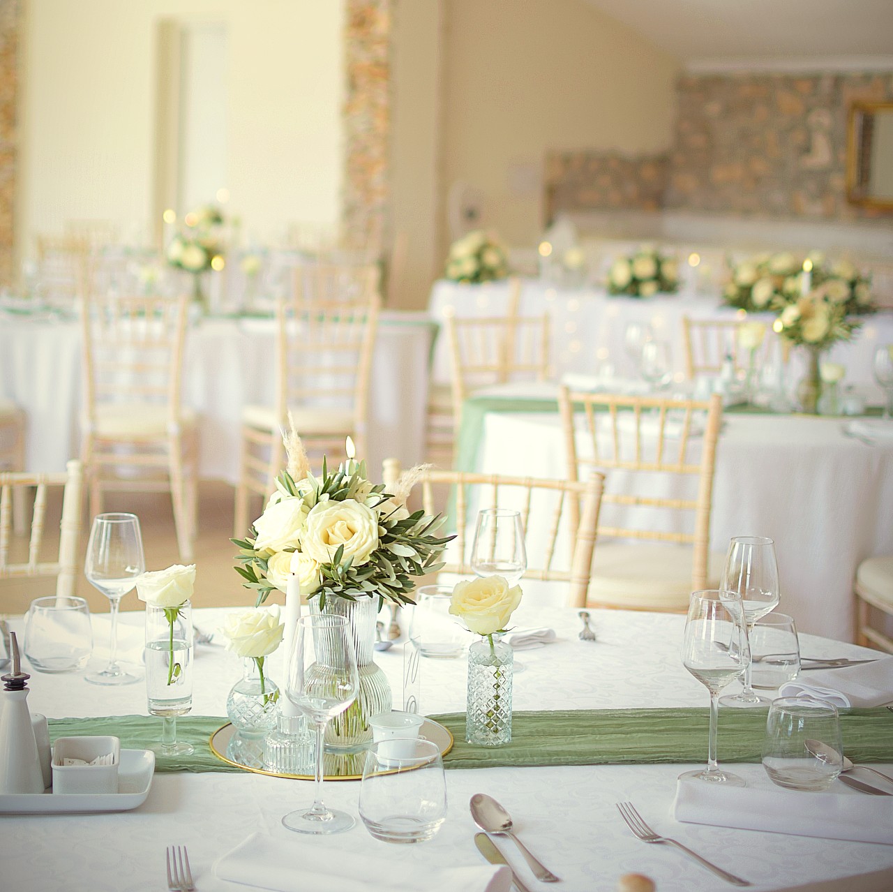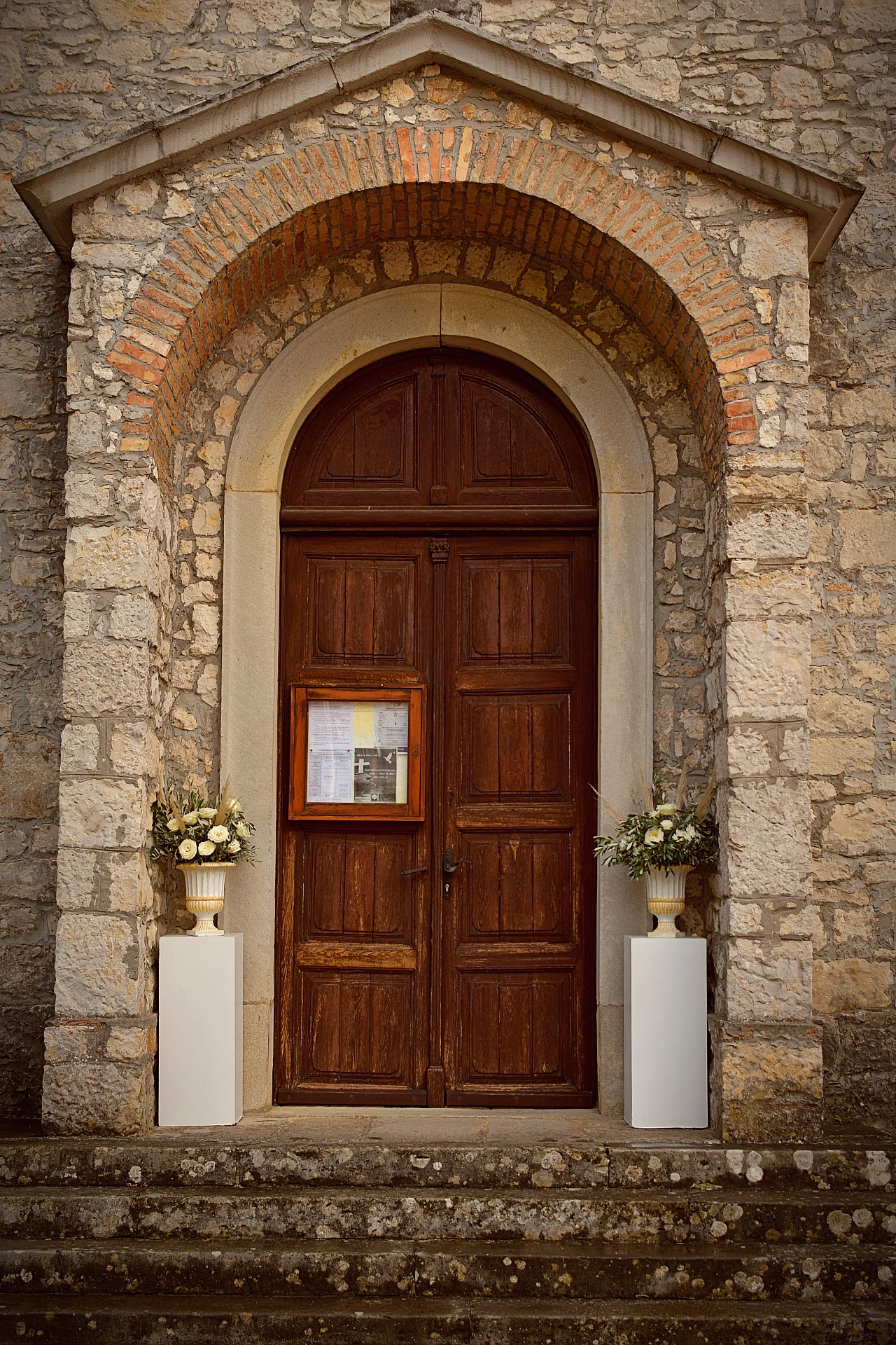 U tjednu pred svadbu pomogla sam Aurori okititi dvorište i šator i nastavila s našim pripremnim radovima. Pripreme su tekle standardno, sve detalje smo dogovorile, zatim naručivanje cvijeća, priprema inventara, prilagodba i personalizacija inventara, priprema cvjetnih aranžmana, nabava potrošnog materijala... Večer prije svadbe smo još uklađivale neke detalje dekoracije na stolovima i ujutro na dan svadbe dostavljam Aurori buket, revere i uređujem ostatak dvorišta. Ona juri na frizuru, pozdravljam je na brzinu i nastavljam raditi ali već ujutro u 8 je kiša odlučila remetiti planove. Srećom su u dvorištu bili postavljeni šator i suncobrani pa gosti neće kisnuti. Optimistično razmišljam kako je tek 8 ujutro pa do 2 popodne će se vrijeme stabilizirati. Odlazim nakrcati kombi do kraja sa cvjetnim aranžmanima, stiže i ostatak mojeg dream team-a te krećemo dekorirati crkvu. Kiša nas prati cijelo vrijeme a ja se cijelo vrijeme nadam da će prestati budući da određeni elementi dekora predviđeni za vanjski prostor poput welcome foto-ogledala, bijelih stalaka sa vazama na ulazu u crkvu itd. Aurora je izabrala kombinaciju bijelih ruža, maslina i malo pampasa u aranžmanima pa smo taj uzorak koristili za dekorirati crkvu i isto ćemo koristiti u restoranu. Nakon dekoriranja crkve kiša prestaje, presretna nastavljam prema Kršanu u restoran gdje nas čeka i auto za dekoriranje.