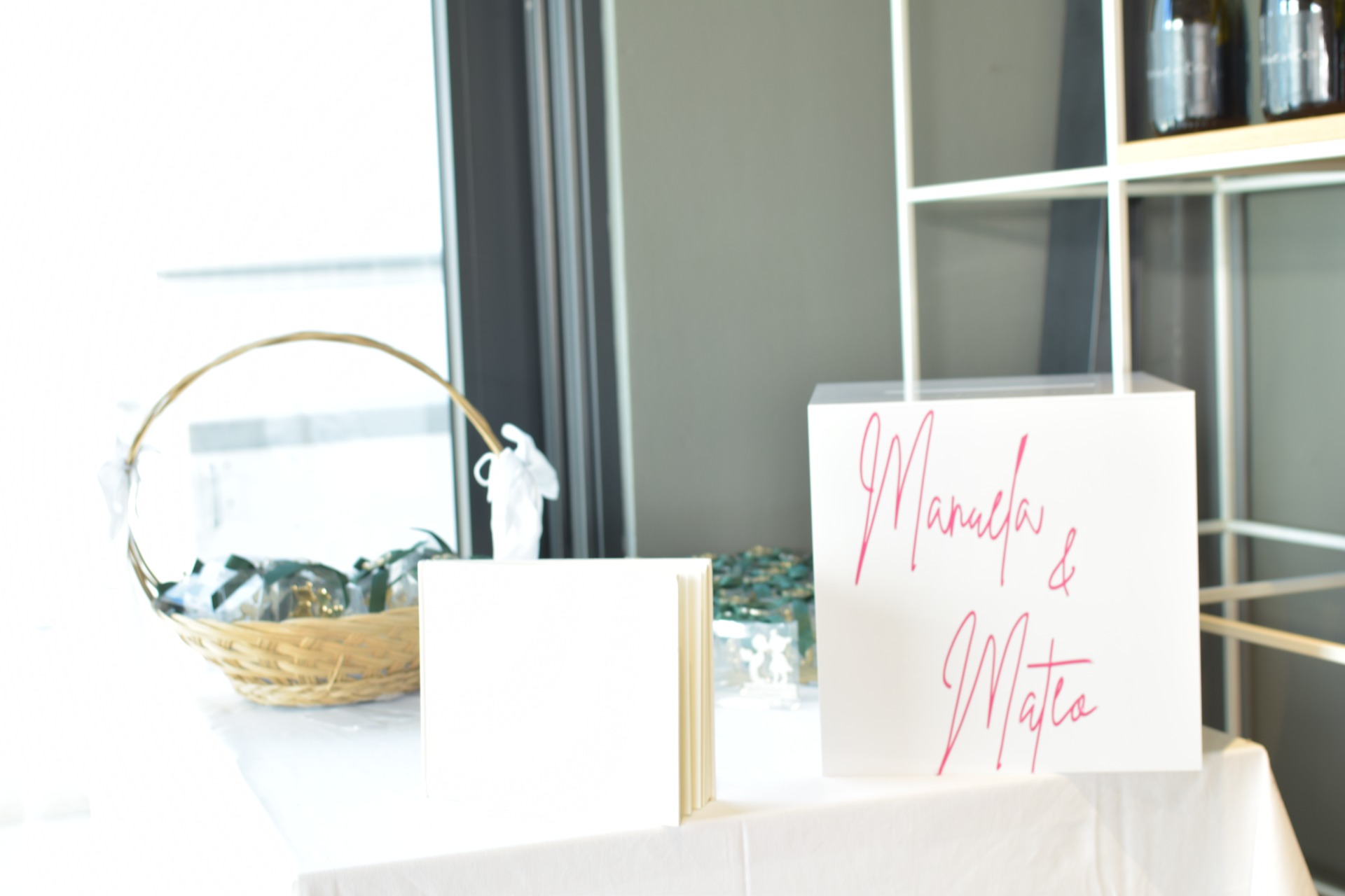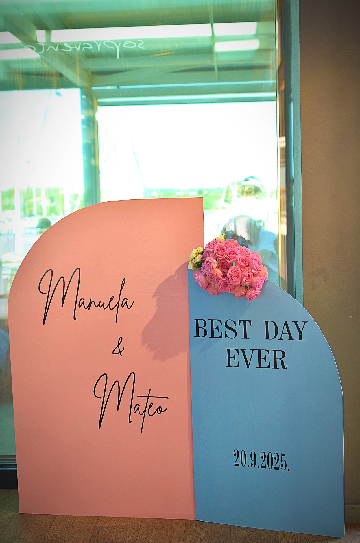 Nakon prošlog vjenčanja u Puli gdje smo imali problema sa crkvenim kartelom, ovaj put je sve prošlo savršeno u crkvi. Crkva na Velom vrhu ima svećenika s kojim smo se lako dogovorili za detalje oko otvaranja crkve ujutro na dan vjenčanja i nema crkveni kartel baba. Iako su imali krštenje zakazano prije vjenčanja, nisu komplicirali i dozvolili su nam ulaz prije krštenja. Rano ujutro stižemo u crkvu gdje nas je dočekala simpatična časna sestra s kojom smo se fino raspričali dok smo postavljali dekor. U međuvremenu je mladenkin brat dovezao auto pred crkvu da ukrasimo, po njemu sam poslala mladenki buket, revere i aranžmane. U crkvi nas je kratko posjetila i mladenka, bilo mi je baš drago vidjeti je. Nakon crkve odlazimo u Pomer dekorirati restoran. Iskrcavamo sav inventar i cvijeće iz kombija, unosimo u restoran i krećemo s dekoriranjem. Tema vjenčanja je bila ljetna sa puno šarenila a i vrijeme se ukopilo u temu, pravo ljetno, toplo i pretoplo. Sve je išlo po planu dok nisam poslala Vanju da složi zahvalnice i postavi kutiju za darivanje. Kutiju za darivanje uvijek personaliziramo mladencima, pa tako smo i ovaj put. I sve je bilo super dok nisam pogledala postavljenu kutiju sa imenima "Manuela & Mateo" okrenutim naopako. Mrak mi pada na oči, naravno prvo dobro opsujem kako mi se moglo dogoditi da naopako zaljepim imena na kutiju, zatim par minuta gledam beznadno u kutiju, slova su jako tanka i mislim da ih neću moći skinuti i ponovno ista postaviti pravilno. Stroj za izradu naljenica je prilično udaljen od mene sada i ne stigne se otići izraditi nove. Neće mi valjda tako dragi mladenci biti bez imena na kutiji?! Na terenu kada radiš nemaš izbora nego izvoditi i nemoguće kad treba, tako da sam uzela male škare, skidala dva po dva slova, rezala ih da mi se nebi cijeli natpis zapetljao i odvajala ih daleko jedne od drugih i vraćala na kutiju. Vanja cijelo vrijeme mirno stoji pored mene i navija za mene. To mi već puno znači, kao nekadašnja sportašica navijanje posebno volim, čitavo vrijeme malo se smijemo, malo ja psujem, malo bi i plakala, Vanja navija, i tako je zaljepljeno je zadnje slovo natrag bez oštećenja.