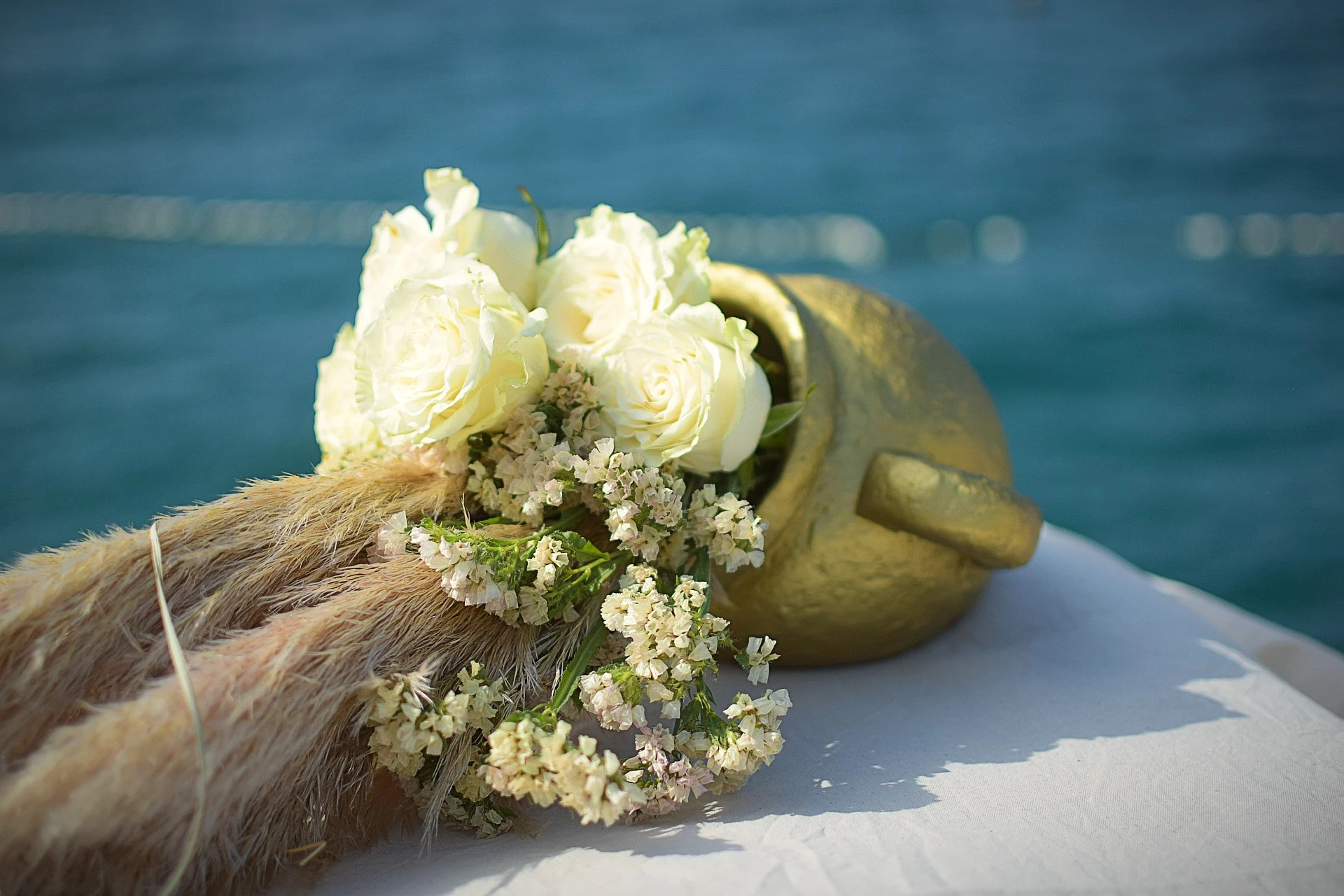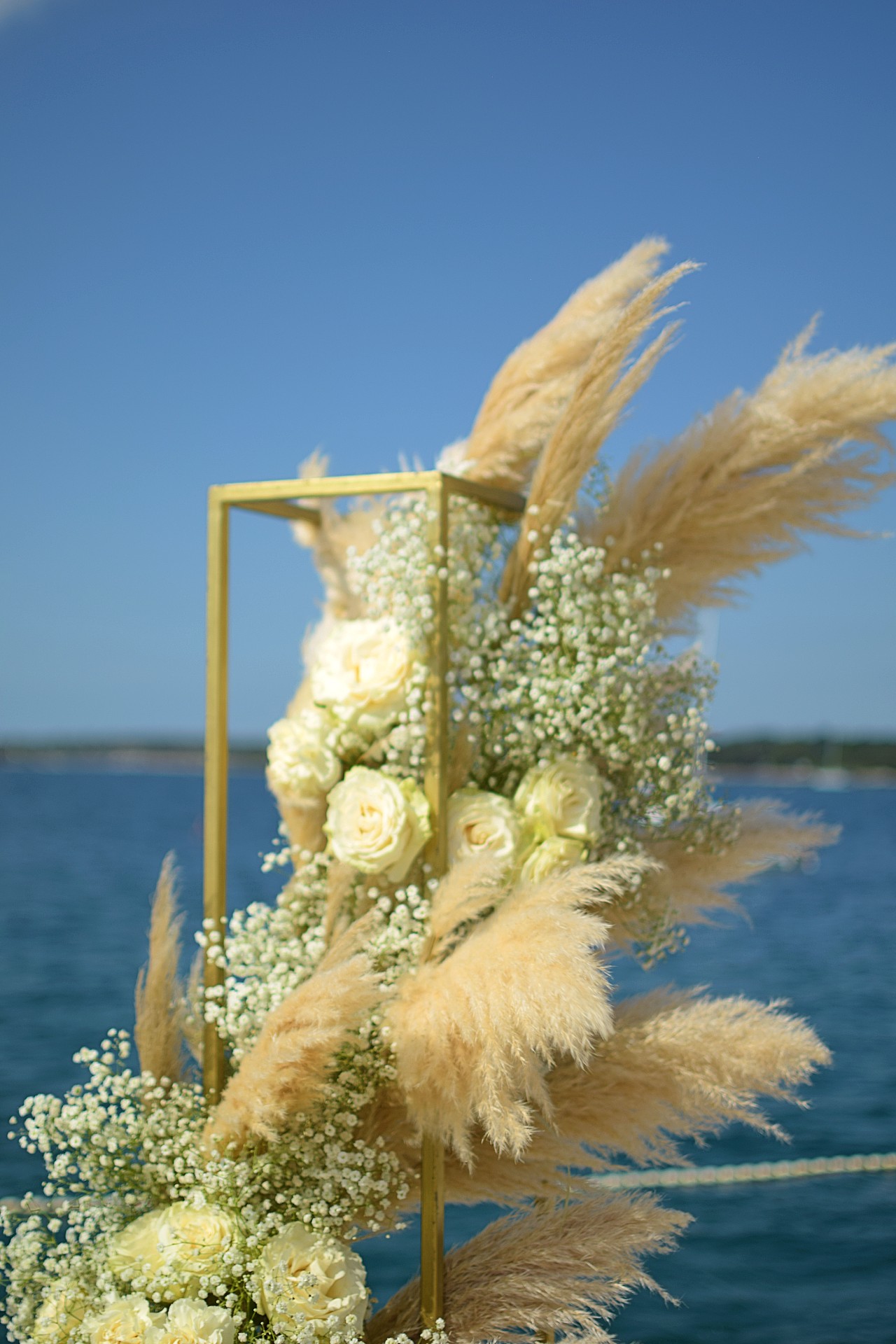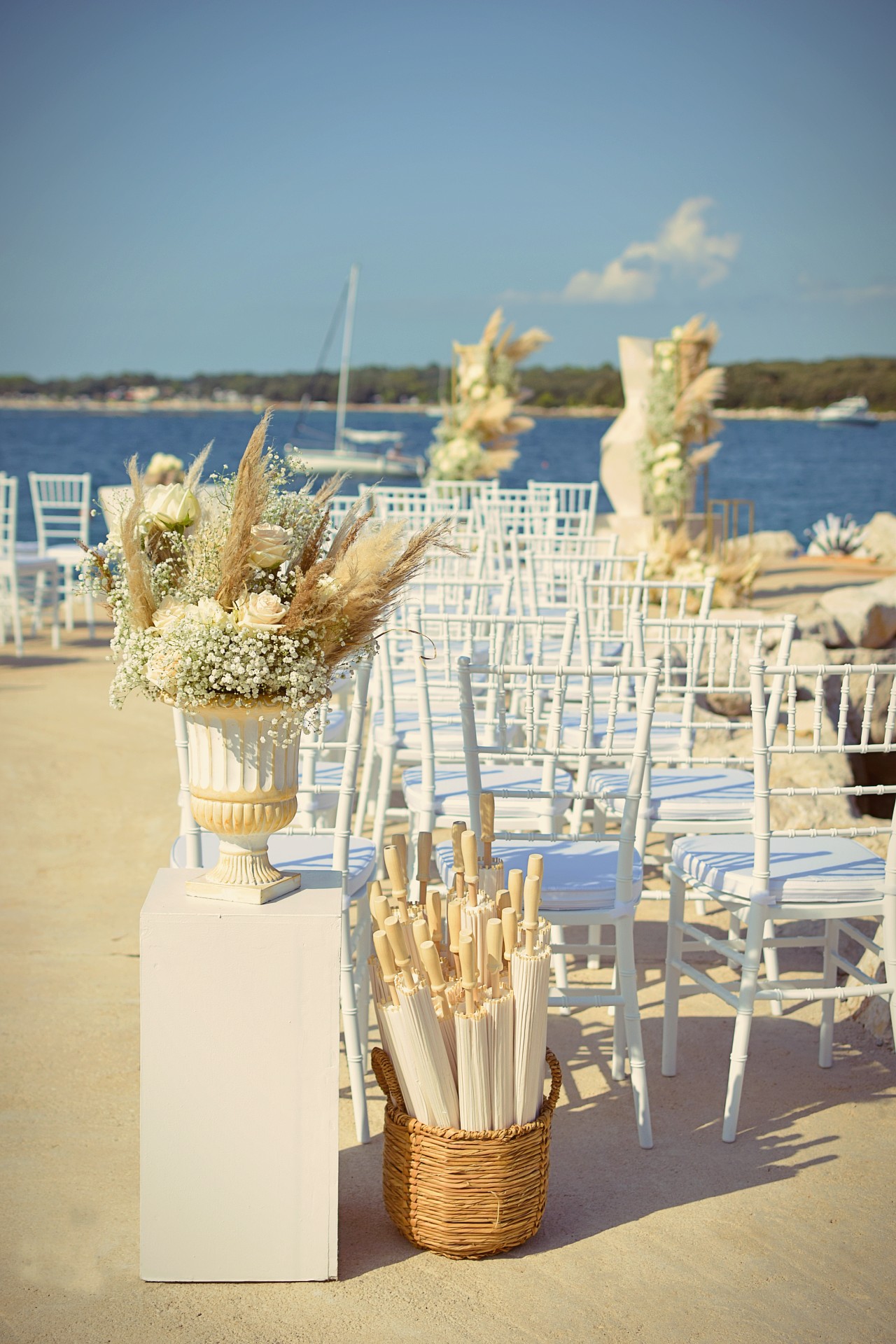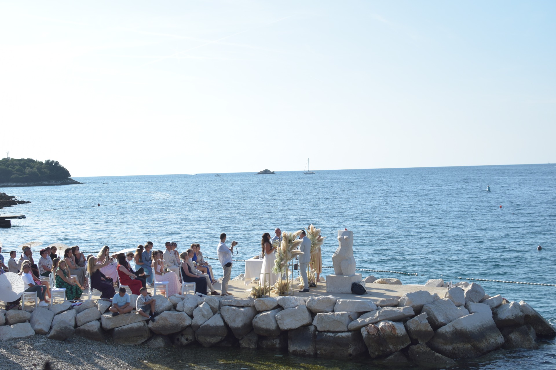 Parkiramo kombi dalje od predviđene lokacije samo zato jer je to bilo jedino mjesto u hladu. Barem jedna ceremonija na otvorenom da prođe bez sunčanice, jer rad na suncu satima u podne redovito rezultira sunčanicom. Pa kada netko pita zašto ceremonija na otvorenom košta toliko koliko košta, instinktivno bi najrađe rekla "Eh kad bi ti znala u kojim uvjetima nastaje tvoja savršena ceremonija nebi me to ni pitala". I tako krećemo mi veselo u hladu postavljati cvijeće i pampase na predviđene cvjetne stupove za ceremoniju, ali veselje nije dugo potrajalo, hlad je bio sve tanji a mi nismo do kraja ni završili cvjetne stupove sunce nas je fino počelo grijati. Dok čekamo da stigne kombi sa stolicama, sjedimo u beach baru i pijuckamo hladna pića. Mala doza glamura je uvijek potrebna. Stižu dečki sa stolicama, iskrcaju ih i odlaze a mi onda krećemo postavljati dekor u zonu ceremonije, ali prije treba potjerati kupače s plaže. Pa mi glamurozno nosimo stolice i raspoređujemo ih duž mola ljudima pored šugamana jer nemamo puno vremena čekati da oni sami pokupe svoje morske štrafaniče. Nakon slaganja stolica vrijeme je i za cvjetne stupove koje treba osigurati dovoljnom težinom zbog vjetra, ipak nebi bilo prikladno da se usred ceremonije stupovi ruše po mladencima i kumovima. Zato smo mi tu da ništa ne prepuštamo sreći već da svaki element dekora tehnički prilagodimo i osiguramo funkcionalnost i estetiku. Nosimo i bijele stalke za visoke vaze na početku zone ceremonije. Svaki komad nosimo ručno preko šljunčane plaže jer nema alternativnog puta do mola, postavljamo natpis dobrodošlice, ostatak cvjetnih aranžmana , na brzinu poslikamo i taman stižu prvi uzvanici. Mi napuštamo zonu ceremonije i vraćamo se gore u beach bar na ručak pa ćemo od tamo dežurati i pratiti ceremoniju.