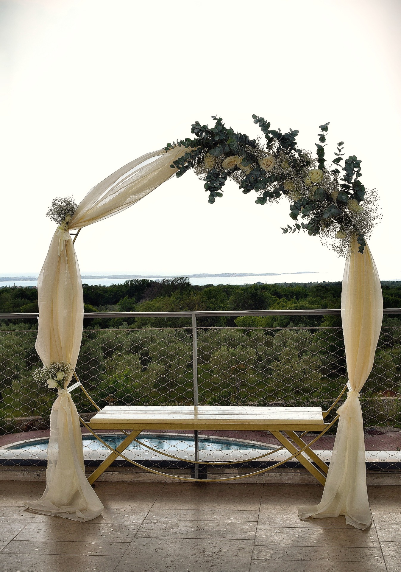 Prva stanica nam je lokacija za dekoriranje auta pa crkva u Loboriki. Simpatična gospođa Nevija nam dolazi otključati crkvu i ostaje s nama za vrijeme dekoriranja, čakula po čakula pred kraj nam je stigla i mladenka u kratku posjetu. Provjerila ako je sve u redu i mirne glave može dalje. Kad smo završili sa crkvom, vozimo tetu Neviju doma u Radeki polje i pravac Vodnjan. Stižemo na prekrasnu lokaciju s pogledom na more, i onda slijedi glamurozan dio iskrcavanje svega. I onda još glamuroznije nošenje klupe za slikanje na kat, tj. na otvorenu terasu na krovu objekta. Klupa nije baš lagana a stepenica je bezbroj. Ali mi smo to dovukli gore hrabro, pjevajući i oponašajući muziku iz dramatičnih filmova. Svake 3 stepenice smo imali pauzu jer smo se dramatično valjali od smijeha usput. Nećemo je još dekorirati jer je prevruće, gornju terasu ćemo zadnju srediti. Spuštamo se u restoran srediti unutarnji dio predviđen za večeru. Mladenci dolaze predvečer oko 18 sati, sada je tek 11 sati pa imamo dovoljno vremena za sve postaviti. Dok peglam platno za glavni stol, stiže simpatična cura s recepcije i kaže da u 13 sati imaju krizmu u drugoj sali ali kroz ovu salu će uzvanici prolaziti pa bi bilo najbolje da do 13 završimo s radovima tu. O sada smo u problemu, nema šanse da to završimo u roku od 2 sata, ali šta je tu je #rukenamuke i stvaljamo se u turbo pogon. Naravno da nismo stigli do 13 sa svim radovima, ali barem smo stigli maknuti kutije i rasporediti inventar. Dekor se uvijek postavlja diskretno, bez velikog nereda i galame, kao da te nema. Kada su uzvanici s krizme prošli kroz salu, mi nastavljamo dalje s našim dekoriranjem.