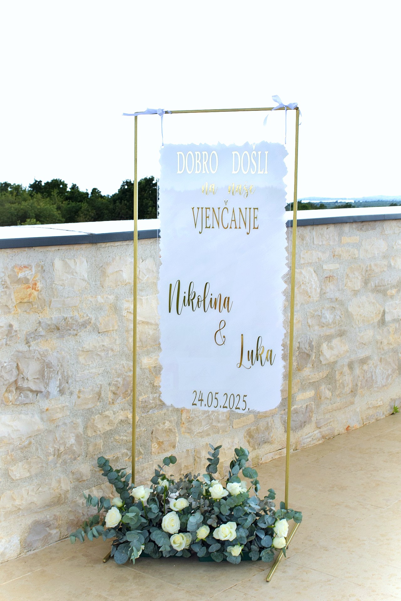 Opet pada kiša, dok razbijam glavu kako ću sutra raditi na otvorenom i montirati tematski dekor za Valentinovo i maškare natipkati ću kako nam je bilo na vjenčanju Nikoline i Luke. I na njihovom vjenčanju nas kiša nije zaobišla, ali krenimo redom. Mladenka Nikolina se javila u zadnji čas u zimskom periodu i uspjela ugrabiti termin budući da se radilo o 24.5.2025. a to je kasnije bio jako traženi termin. Nakon njene rezervacije krenula je lavina upita za njen datum, a dok drugi kasno šalju upite mi smo već krenule s pripremama. Imali smo dvije lokacije za dekoriranje, crkvu u Loboriki, te u Vodnjanu restoran u kampu Papafigo. Na sastanku smo definirale sve detalje dekora, od cvjetnih aranžmana, buketa, dekora u crkvi, dekor auta, cvjetnog luka, revera, uređenje terase za prijem uzvanika, natpis dobrodošlice, dekoriranje stolova za uzvanike, menu kartice...